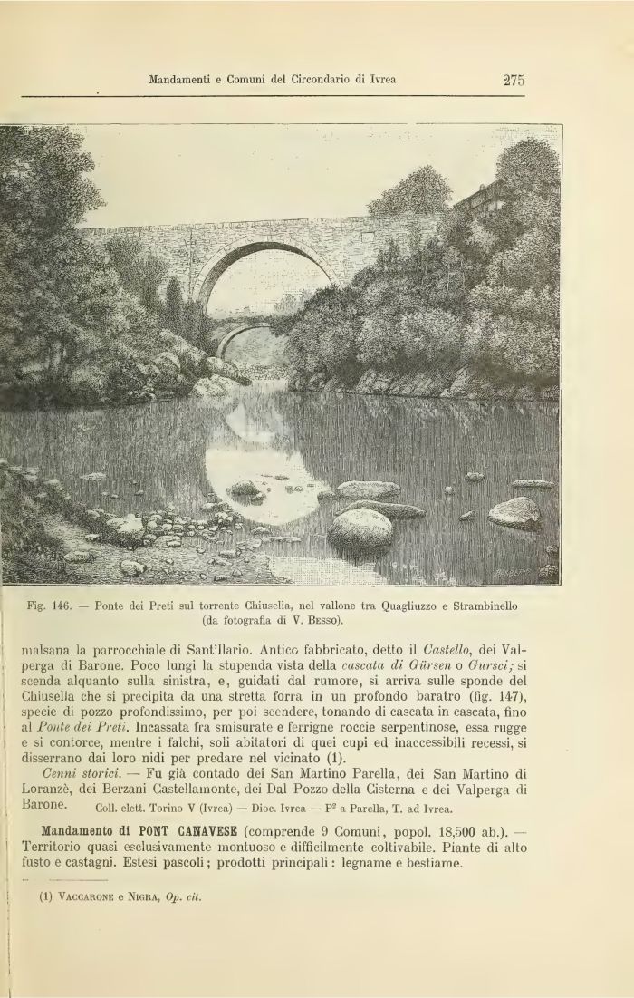malsana la parrocchiale di Sant'Ilario. Antico fabbricato, detto il Castello, dei Val-perga. di Barone. Poco lungi la stupenda vista della cascata di Gursen o Gursci; si scenda alquanto sulla sinistra, e, guidati dal rumore, si arriva sulle sponde del Chiusella che si precipita da una stretta forra in un profondo baratro (fig. 147), specie di pozzo profondissimo, per poi scendere, tonando di cascata in cascata, fino al Ponte dei Preti. Incassata fra smisurate e ferrigne roccie serpentinose, essa rugge I e si contorce, mentre i falchi, soli abitatori di quei cupi ed inaccessibili recessi, si disserrano dai loro nidi per predare nel vicinato (1).