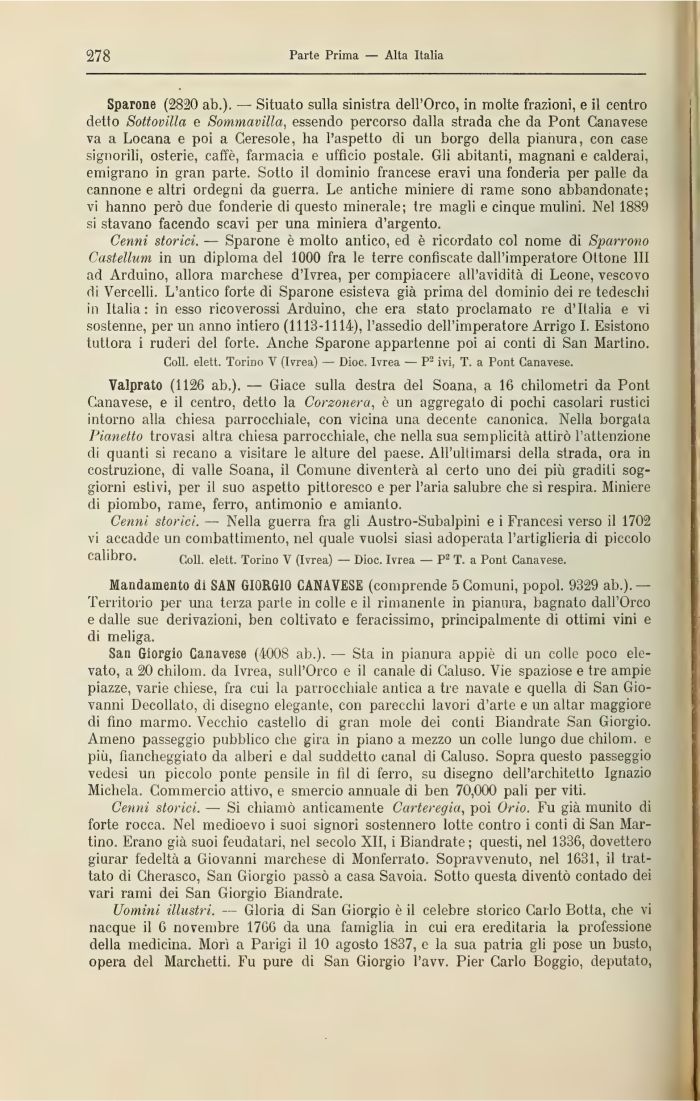 Valprato (1126 ab.). — Giace sulla destra del Soana, a 16 chilometri da Pont Canavese, e il centro, detto la Corzonera, è un aggregalo di pochi casolari rustici intorno alla chiesa parrocchiale, con vicina una decente canonica. Nella borgata Pianetto trovasi altra chiesa parrocchiale, che nella sua semplicità attirò l'attenzione di quanti si recano a visitare le alture del paese. All'ultimarsi della strada, ora in costruzione, di valle Soana, il Comune diventerà al certo uno dei più gradili soggiorni estivi, per il suo aspetto pittoresco e per l'aria salubre che si respira. Miniere di piombo, rame, ferro, antimonio e amianto.