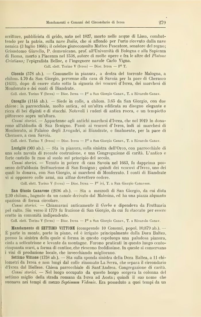 Mandamento di SETTIMO VITT0NE (comprende 10 Comuni, popol. 10,879 ab.). -, È parte in monte, parte in piano, ed è irrigato principalmente dalla Dora Baltea, presso la sinistra della quale si forma in questo capoluogo una paludosa pianura, cinta a settentrione e levante da montagne. Furono praticati in questo luogo centocinquanta scavi, a forma di cantine, che riescono freddissime. In queste si conservano i vini di produzione locale, che invecchiando migliorano.