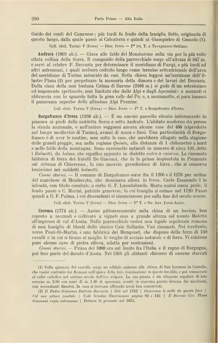 Andrate (1069 ab.). — Giace alle falde del Mombarone sulla via per la più volte citata collina della Serra. Il campanile della parrocchiale sorge all'altezza di 847 m. c servi al celebre P. Beccaria per determinare il meridiano di Parigi, e più tardi ad altri astronomi, i quali scelsero codesto luogo come termine settentrionale dell'arco del meridiano di Torino misurato da essi. Nella chiesa leggesi un'iscrizione dell' illustre Plana (2) per perpetuare la memoria della dimora e dei lavori del Beccaria. Dalla cima della non lontana Colma di Barone (2404 m.) si gode di un estesissimo ed imponente spettacolo, non limitato che dalle Alpi e dagli Apennini : a mezzodì si abbraccia con lo sguardo tutta la gran valle del Po, e, a mezzanotte, si para innanzi il panorama superbo delle altissime Alpi Pennine.