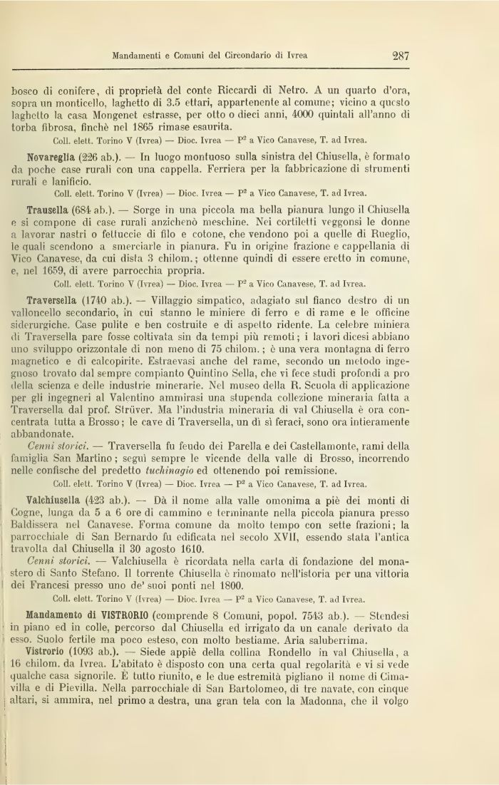 Trausella (684 ab.). — Sorge in una piccola ma bella pianura lungo il Chiusella e si compone di case rurali anzichenò meschine. Nei cortiletti veggonsi le donne a lavorar nastri o fettuccie di filo e cotone, che vendono poi a quelle di Rueglio, le quali scendono a smerciarle in pianura. Fu in origine frazione e cappellania di Vico Canavese, da cui dista 3 chilom. ; ottenne quindi di essere eretto in comune, e, nel 1659, di avere parrocchia propria.