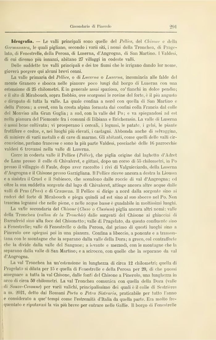 Idrografia. — Le valli principali sono quelle del Pellice, del Chisone e della Germanasca, le quali pigliano, secondo i varii siti, i nomi della Tronchea, di Prage-lato, di Fenestrelle, della Perosa, di Luserna, d'Angrogna, di San Martino. I Valdesi, di cui diremo più innanzi, abitano 27 villaggi in codeste valli.