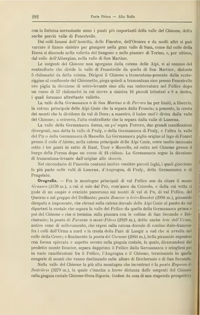 Orografia. — Fra le montagne principali di vai Pellice son da citare il monte Granerò (8170 m.), a cui si sale dal Prà, com'anco da Crissolo, e dalla cui vetta si gode di un ampio e svariato panorama sui monti di vai di Po, di vai Pellice, del Queiras e sul gruppo del Delfinato; punta Boucier o bric-Boucliet (2998 m.), piramide dirupata e imponente, che elevasi sulla catena dorsale delle Alpi Gozie al punto da cui dipartesi la costale che separa la valle del Pellice da quella della Germanasca prima e poi del Ghisone e che si termina sulla pianura con le colline di San Secondo e Bri-cherasio ; la punta di Paravas o mont-Pelvas (2929 m.), detto anche brio dell' Urina, antico cono di sollevamento, che ergesi sulla catena dorsale di confine italo-francese fra i colli dell'Urina a nord e la cresta della Paré di Longir a sud che si avvalla nel colle della Croce; e finalmente la punta del Cornour (2868 m.), bella piramide ergentesi con forma spiccata e aspetto severo sulla giogaia costale, la quale, diramandosi dal predetto monte Boucier, separa dapprima il Pellice dalla Germanasca e sciogliesi poi in varie ramificazioni fra il Pellice, l'Angrogna e il Ghisone, terminando in quella congerie di monti che vanno declinando sulle alture di Bricherasio e di San Secondo.