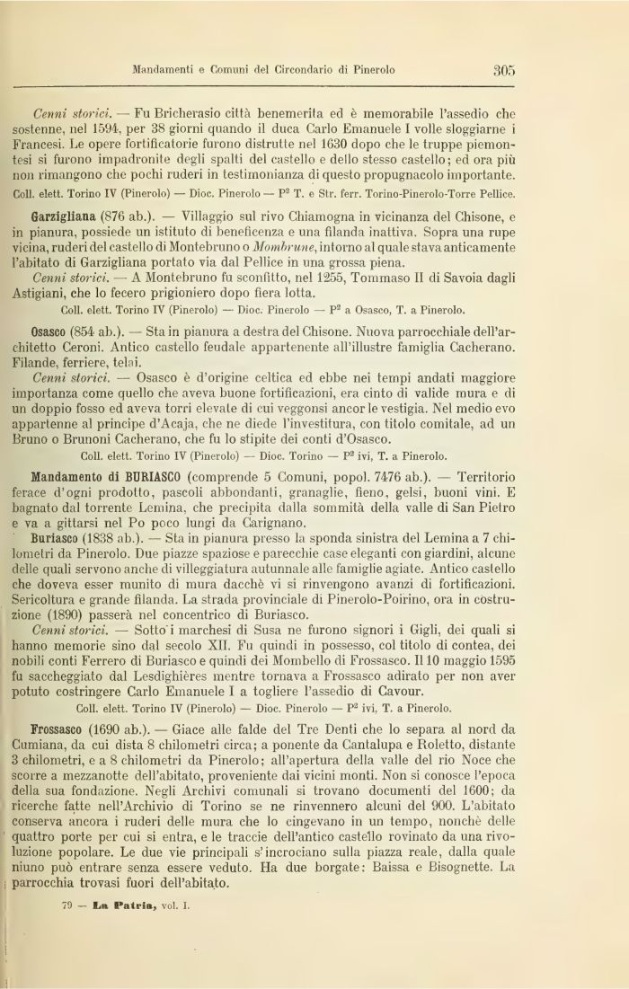 Cenni storici. — Fu Bricherasio città benemerita ed è memorabile l'assedio che sostenne, nel 1594, per 38 giorni quando il duca Carlo Emanuele I volle sloggiarne i Francesi. Le opere fortificatorie furono distrutte nel 1630 dopo che le truppe piemontesi si furono impadronite degli spalti del castello e dello stesso castello; ed ora più non rimangono che pochi ruderi in testimonianza di questo propugnacolo importante. Coli, elett. Torino IV (Pinerolo) — Dioc. Pinerolo — P3 T. e Str. ferr. Torino-Pinerolo-Torre Pellice.