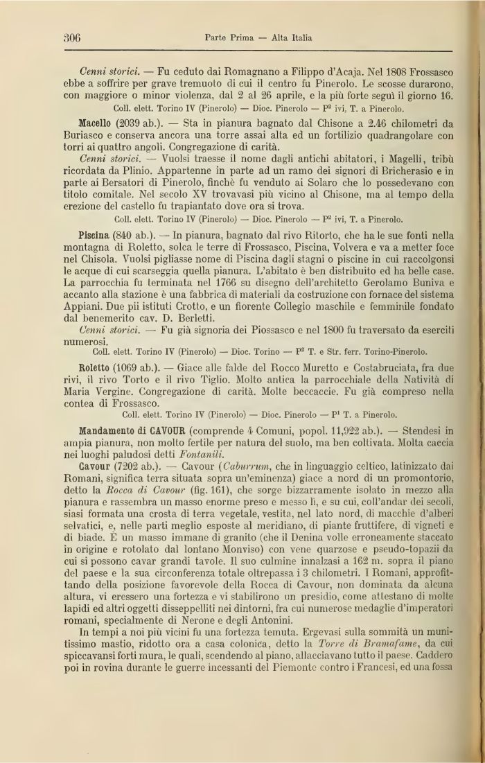 Cavour (7202 ab.). — Cavour (Caburrum, che in linguaggio celtico, latinizzato dai Romani, significa terra situata sopra un'eminenza) giace a nord di un promontorio, detto la Bocca di Cavour (fig. 161), che sorge bizzarramente isolato in mezzo alla pianura e rassembra un masso enorme preso e messo lì, e su cui, coll'andar dei secoli, siasi formata una crosta di terra vegetale, vestita, nel lato nord, di macchie d'alberi selvatici, e, nelle parti meglio esposte al meridiano, di piante fruttifere, di vigneti e di biade. È un masso immane di granito (che il Denina volle erroneamente staccato in origine e rotolato dal lontano Monviso) con vene quarzose e pseudo-topazii da cui si possono cavar grandi tavole. Il suo culmine innalzasi a 162 m. sopra il piano del paese e la sua circonferenza totale oltrepassa i 3 chilometri. I Romani, approfittando della posizione favorevole della Rocca di Cavour, non dominata da alcuna altura, vi eressero una fortezza e vi stabilirono un presidio, come attestano di molte lapidi ed altri oggetti disseppelliti nei dintorni, fra cui numerose medaglie d'imperatori romani, specialmente di Nerone e degli Antonini.