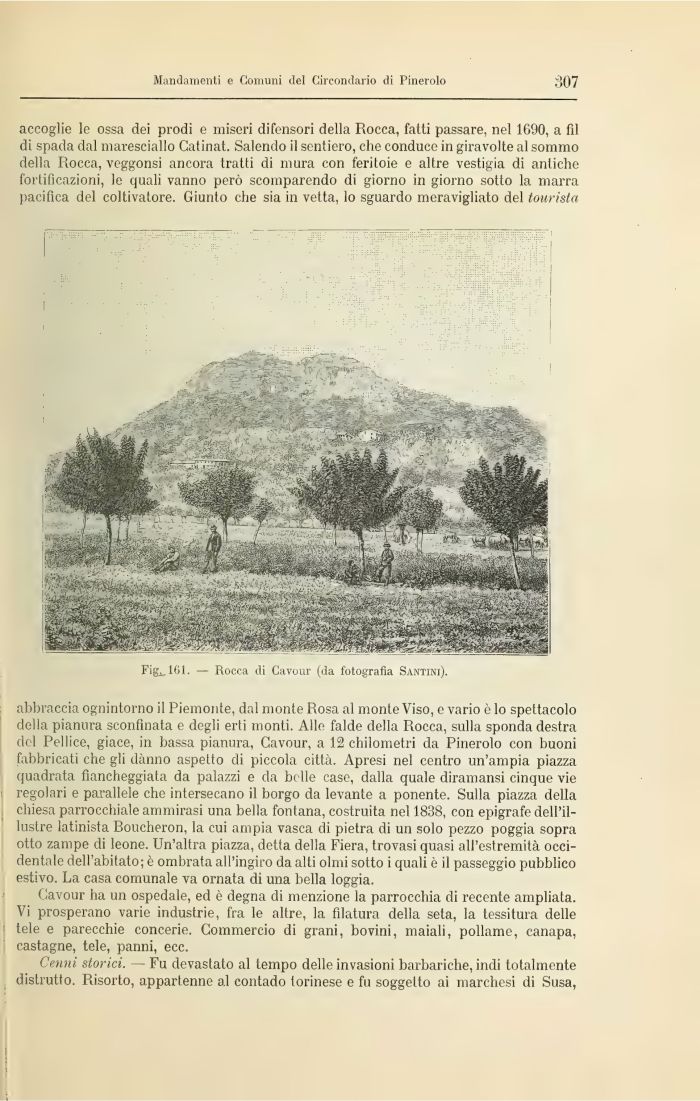 abbraccia ognintorno il Piemonte, dal monte Rosa al monte Viso, e vario e lo spettacolo della pianura sconfinata e degli erti monti. Alle falde della Rocca, sulla sponda destra del Pollice, giace, in bassa pianura, Cavour, a 12 chilometri da Pinerolo con buoni fabbricati che gli dànno aspetto di piccola città. Apresi nel centro un'ampia piazza quadrata fiancheggiata da palazzi e da belle case, dalla quale diramansi cinque vie i regolari e parallele che intersecano il borgo da levante a ponente. Sulla piazza della chiesa parrocchiale ammirasi una bella fontana, costruita nel 1838, con epigrafe dell'illustre latinista Boucheron, la cui ampia vasca di pietra di un solo pezzo poggia sopra otto zampe di leone. Un'altra piazza, detta della Fiera, trovasi quasi all'estremità occidentale dell'abitato; è ombrata all'ingiro da alti olmi sotto i quali è il passeggio pubblico estivo. La casa comunale va ornata di una bella loggia.