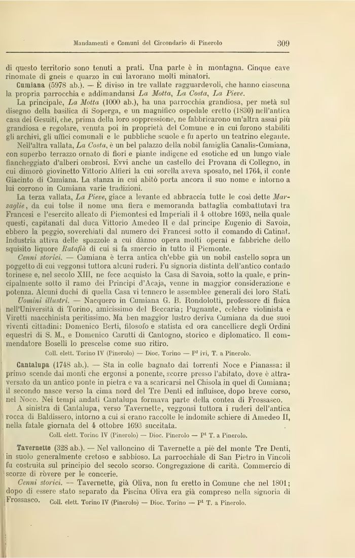 Cumiana (5978 ab.). — È diviso in tre vallate ragguardevoli, che hanno ciascuna la propria parrocchia e addimandansi La Motta, La Costa, La Pieve.
