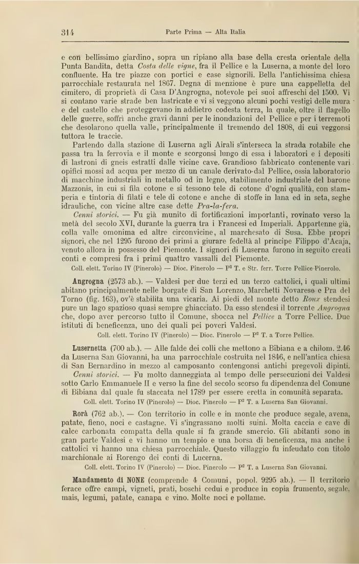 Angrogna (2573 ab.). — Valdesi per due terzi ed un terzo cattolici, i quali ultimi abitano principalmente nelle borgate di San Lorenzo, Marchetti Novarese e Pra del Torno (fig. 163), ov'è stabilita una vicaria. Ai piedi del monte detto Roux stendesi pure un lago spazioso quasi sempre ghiacciato. Da esso stendesi il torrente Angrogna che, dopo aver percorso tutto il Comune, sbocca nel Pellice a Torre Pellice. Due istituti di beneficenza, uno dei quali pei poveri Valdesi.
