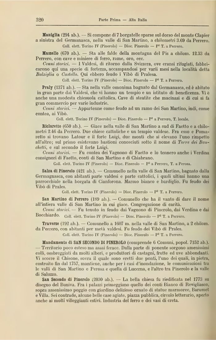 Maniglia (294 ab.). — Si compone di 7 borgatelle sparse sul dorso del monte Clapier a sinistra del Germanasca, nella valle di San Martino, a chilometri 3.69 da Perrero.