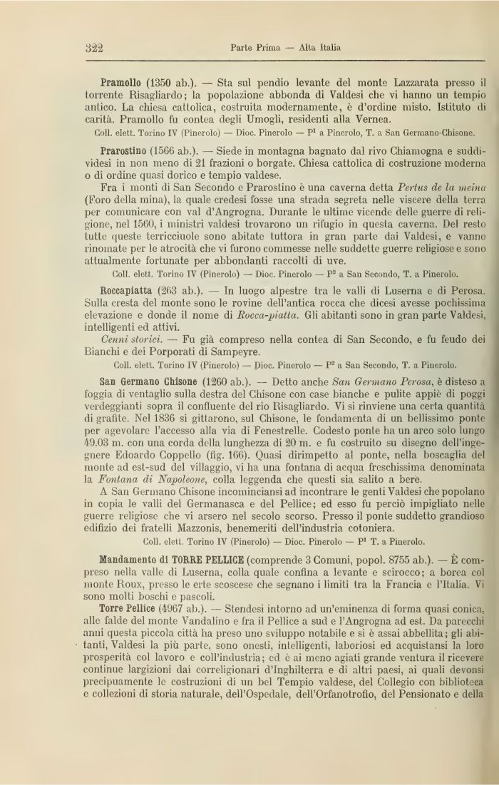 Pramollo (1350 ab.). — Sta sul pendio levante del monte Lazzarata presso il torrente Risagliardo ; la popolazione abbonda di Valdesi che vi hanno un tempio antico. La chiesa cattolica, costruita modernamente, è d'ordine misto. Istituto di carità. Pramollo fu contea degli Umogli, residenti alla Vernea.