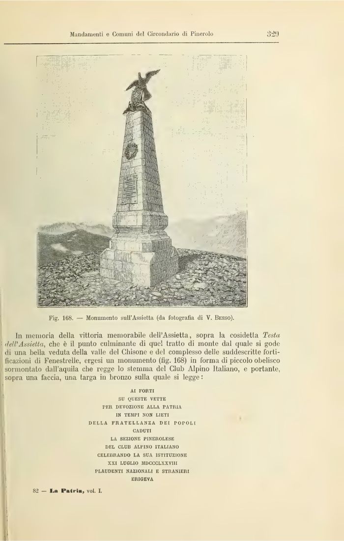 In memoria della vittoria memorabile dell'Assietta, sopra la cosidetta Testa : dell'Assietta, che è il punto culminante di quel tratto di monte dal quale si gode di una bella veduta della valle del Ghisone e del complesso delle suddescritte fortificazioni di Fenestrelle, ergesi un monumento (fig. 168) in forma di piccolo obelisco sormontalo dall'aquila che regge lo stemma del Club Alpino Italiano, e portante, sopra una faccia, una targa in bronzo sulla quale si legge: