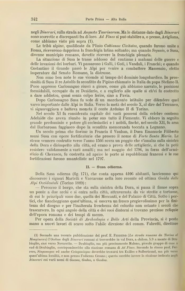 (1) Secondo una recente pubblicazione del prof. E. Ferrerò (La strada romana da Torino al Monginevro) l'Ocelum degli Itinerari romani si troverebbe in vai Dora, a chilom. 5.9 a monte di Dru-biaglio, cioè verso Novarelto. — Drubiaglio, ma più precisamente Malono, piccolo gruppo di case a sud di Drubiaglio, corrisponderebbe alla stazione romana di Ad Fines. Secondo lo stesso prof. Ferrerò, Singomagus ed anche Cxingoniagus dovrebbe trovarsi tra Exilles e Salbertrand, ma più verso quest'ultima località, e non presso l'odierna Gesana; questa sarebbe invece la stazione indicata negli Itinerari coi varii nomi di Qoesao, Gadao, o Gesdao.