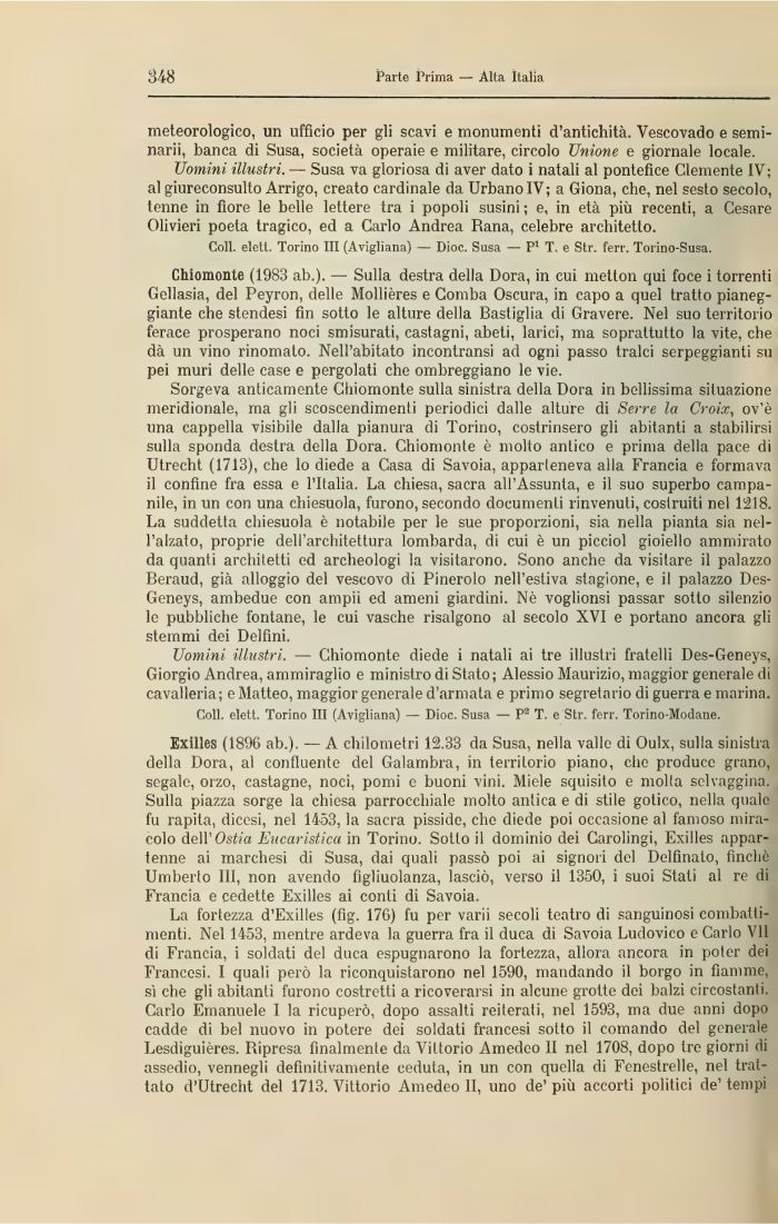 La fortezza d'Exilles (fig. 176) fu per varii secoli teatro di sanguinosi combattimenti. Nel 1453, mentre ardeva la guerra fra il duca di Savoia Ludovico e Carlo VII di Francia, i soldati del duca espugnarono la fortezza, allora ancora in poter dei Francesi. I quali però la riconquistarono nel 1590, mandando il borgo in fiamme, sì che gli abitanti furono costretti a ricoverarsi in alcune grotte dei balzi circostanti. Carlo Emanuele I la ricuperò, dopo assalti reiterati, nel 1593, ma due anni dopo cadde di bel nuovo in potere dei soldati francesi sotto il comando del generale Lesdiguières. Ripresa finalmente da Viltorio Amedeo II nel 1708, dopo tre giorni di assedio, vennegli definitivamente ceduta, in un con quella di Fenestrelle, nel trattato d'Utrecht del 1713. Vittorio Amedeo lì, uno de' più accorti politici de' tempi