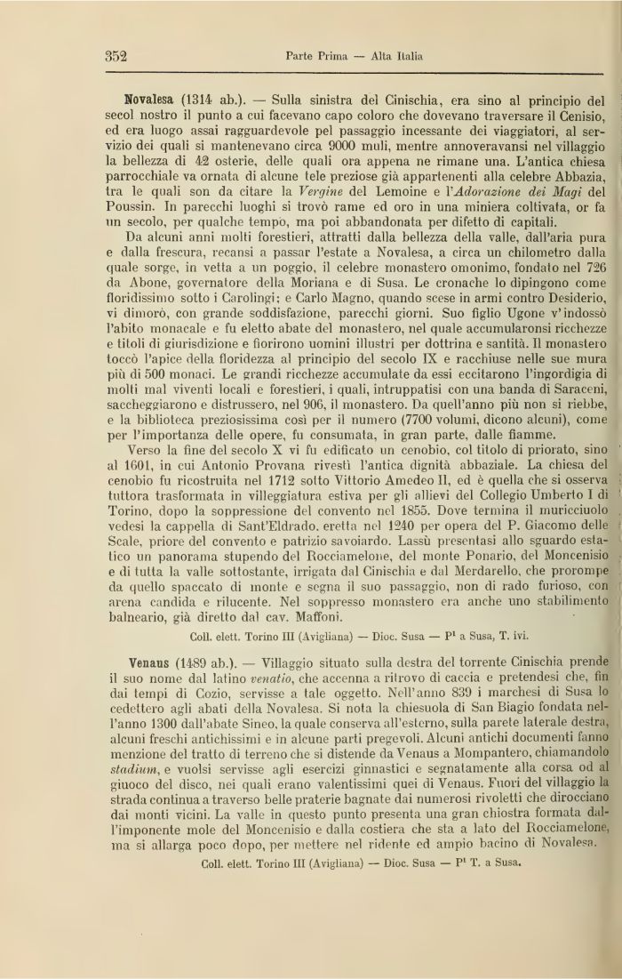 Novalesa (1314 ab.). — Sulla sinistra del Cinischia, era sino al principio del secol nostro il punto a cui facevano capo coloro che dovevano traversare il Cenisio, ed era luogo assai ragguardevole pel passaggio incessante dei viaggiatori, al servizio dei quali si mantenevano circa 9000 muli, mentre annoveravansi nel villaggio la bellezza di 42 osterie, delle quali ora appena ne rimane una. L'antica chiesa parrocchiale va ornata di alcune tele preziose già appartenenti alla celebre Abbazia, tra le quali son da citare la Vergine del Lemoine e l'Adorazione dei Magi del Poussin. In parecchi luoghi si trovò rame ed oro in una miniera coltivata, or fa un secolo, per qualche tempo, ma poi abbandonata per difetto di capitali.