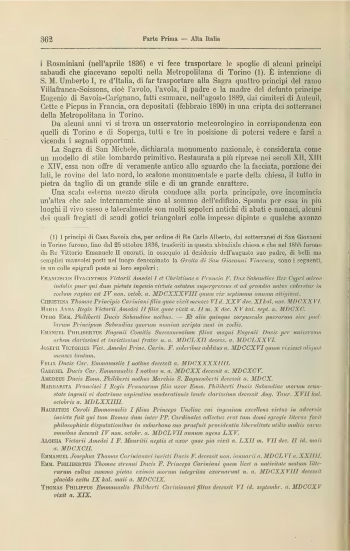 (1) I principi di Gasa Savoia che, per ordine di Re Carlo Alberto, dai sotterranei di San Giovanni in Torino furono, fino dal 25 ottobre 1836, trasferiti in questa abbaziale chiesa e che nel 1855 furono da Re Vittorio Emanuele II onorati, in ossequio al desiderio dell'augusto suo padre, di belli ma semplici mausolei posti nel luogo denominato la Grotta di San Giovanni Vincenzo, sono i seguenti, in un colle epigrafi poste ai loro sepolcri :