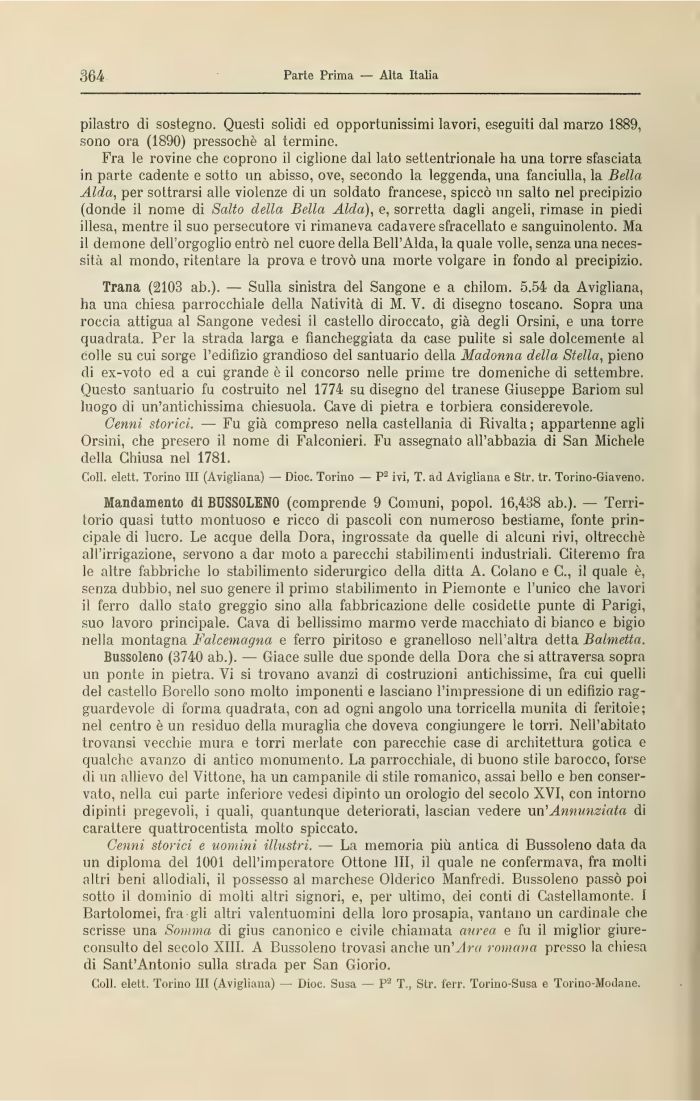 Trana (2103 ab.). — Sulla sinistra del Sangone e a chilom. 5.54 da Avigliana, ha una chiesa parrocchiale della Natività di M. V. di disegno toscano. Sopra una roccia attigua al Sangone vedesi il castello diroccato, già degli Orsini, e una torre quadrata. Per la strada larga e fiancheggiata da case pulite si sale dolcemente al Colle su cui sorge l'edifizio grandioso del santuario della Madonna della Stella, pieno di ex-voto ed a cui grande è il concorso nelle prime tre domeniche di settembre. Questo santuario fu costruito nel 1774 su disegno del tranese Giuseppe Bariom sul luogo di un'antichissima chiesuola. Cave di pietra e torbiera considerevole.