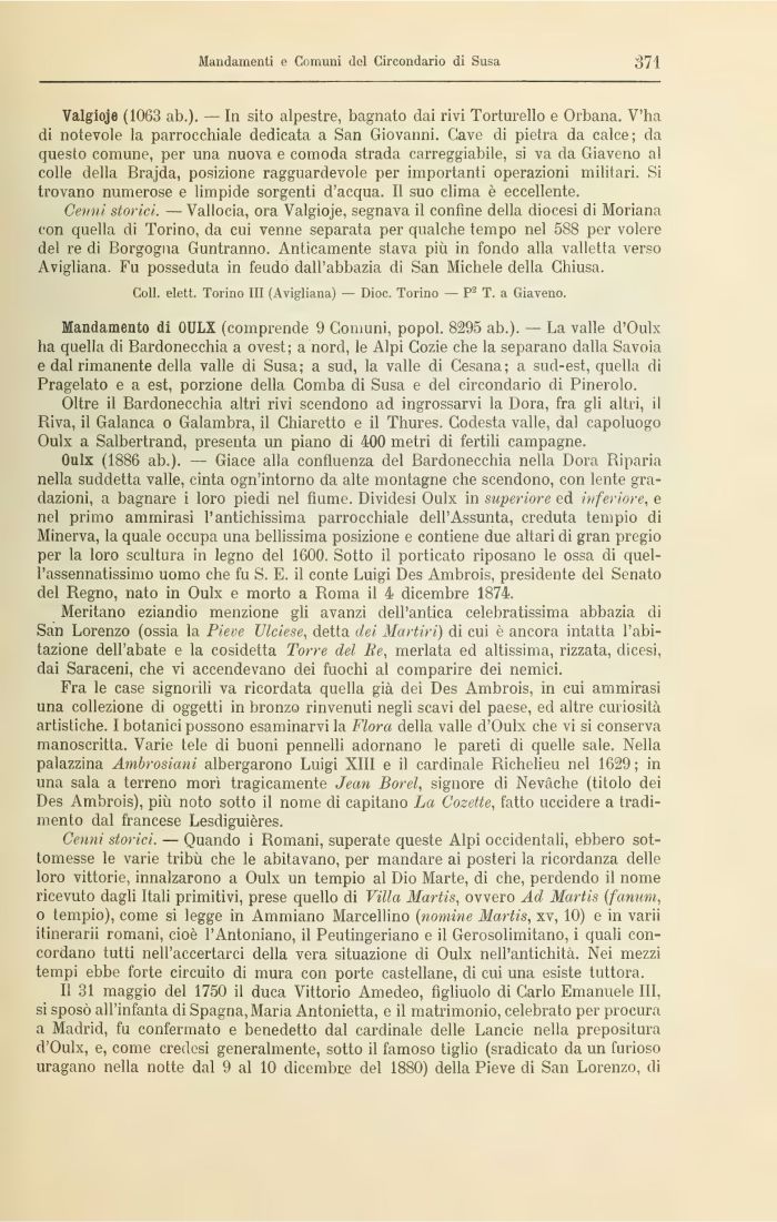 Oulx (1886 ab.). — Giace alla confluenza del Bardonecchia nella Dora Riparia nella suddetta valle, cinta ogn'intorno da alte montagne che scendono, con lente gradazioni, a bagnare i loro piedi nel fiume. Dividesi Oulx in superiore ed inferiore, e nel primo ammirasi l'antichissima parrocchiale dell'Assunta, creduta tempio di Minerva, la quale occupa una bellissima posizione e contiene due altari di gran pregio per la loro scultura in legno del 1600. Sotto il porticato riposano le ossa di quel-l'assennatissimo uomo che fu S. E. il conte Luigi Des Ambrois, presidente del Senato del Regno, nato in Oulx e morto a Roma il 4 dicembre 1874.