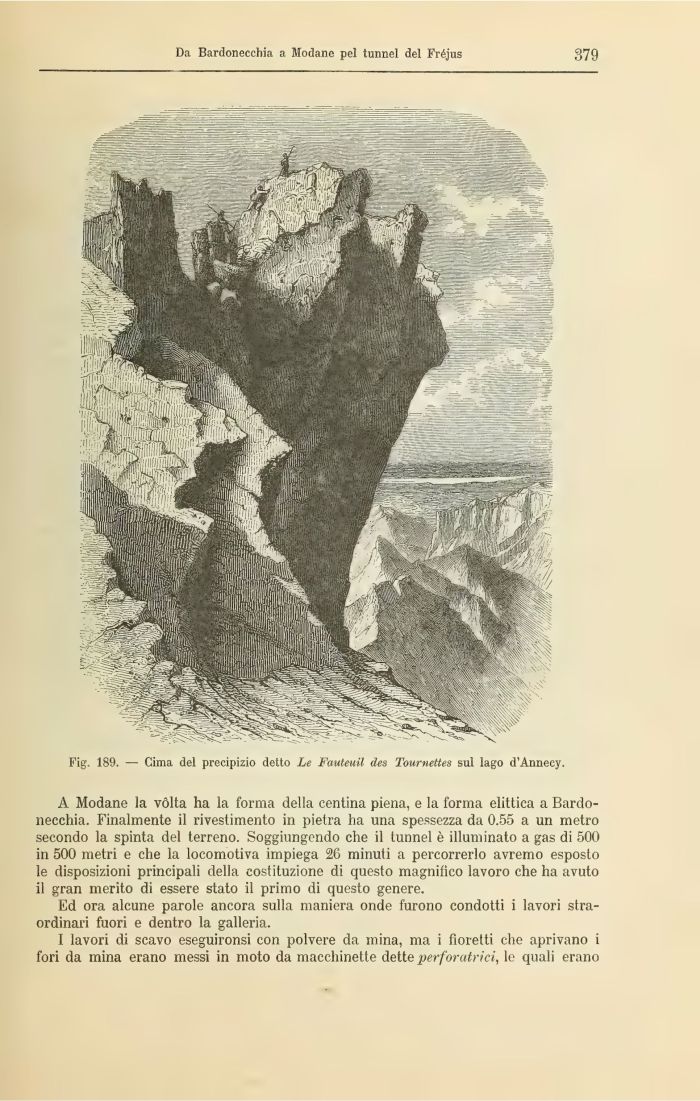 A Modane la vòlta ha la forma della centina piena, e la forma elittica a Bardonecchia. Finalmente il rivestimento in pietra ha una spessezza da 0.55 a un metro secondo la spinta del terreno. Soggiungendo che il tunnel è illuminato a gas di 500 in 500 metri e che la locomotiva impiega 26 minuti a percorrerlo avremo esposto le disposizioni principali della costituzione di questo magnifico lavoro che ha avuto il gran merito di essere stato il primo di questo genere.