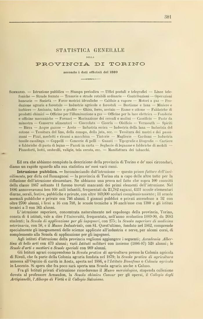 Sommario. — Istruzione pubblica — Stampa periodica — Uffici postali e telegrafici — Linee telefoniche — Strade ferrate — Tramvie e strade rotabili ordinarie — Contribuzioni — Operazioni bancarie — Società — Forze motrici idrauliche — Caldaie a vapore — Motori a gaz — Produzione agraria e forestale — Industrie agricole e forestali — Bestiame e lana — Miniere e torbiere — Amianto, talco e grafite — Ghisa, ferro, acciaio — Bame e ottone — Fabbriche di prodotti chimici — Officine per l'illuminazione a gas — Officine per la luce elettrica — Fonderie e officine meccaniche — Fornaci — Macinazione dei cereali e molini - Caseifìcio — Paste da minestra — Conserve alimentari — Cioccolata — Cicoria — Oleifìcio — Vermouth — Spiriti — Birra — Acque gazose — Aceto — Industria serica — Industria della lana — Industria del cotone — Tessitura del lino, della canapa, della juta, ecc. — Tessitura dei nastri e dei passamani — Pizzi, merletti e ricami a macchina — Tintorie — Maglierie — Cordami — Industria tessile casalinga — Cappelli — Concerie di pelli — Guanti — Tipografìe e litografie — Cartiere e fabbriche di pasta di legno — Parati in carta — Segherie di legname e fabbriche di mobili — Pianoforti, botti, ombrelli, valigie, tela cerata, ecc. — Manifattura dei tabacchi.