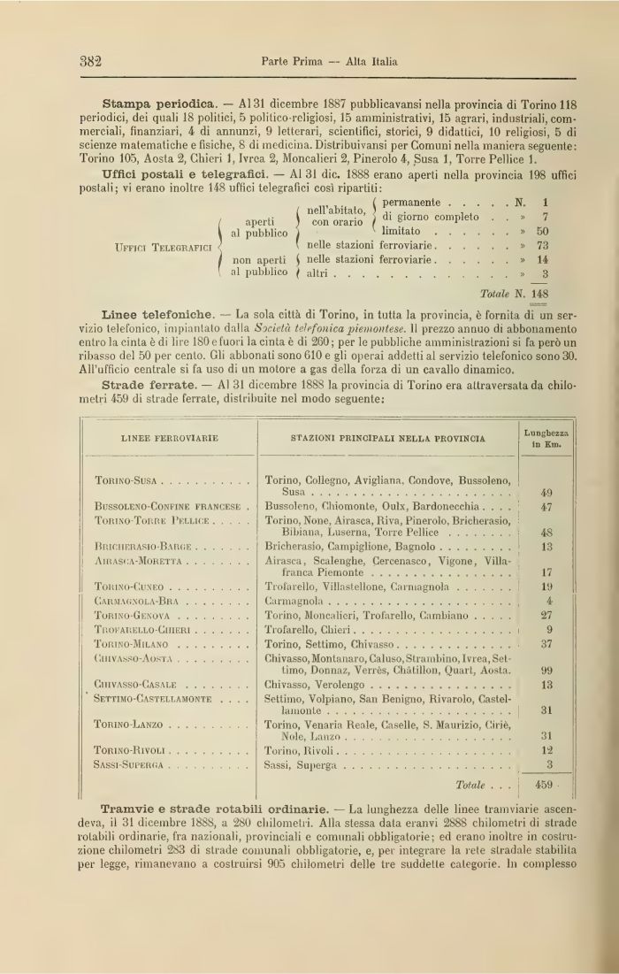 Stampa periodica. — Al 31 dicembre 1887 pubblicavansi nella provincia di Torino 118 periodici, dei quali 18 politici, 5 politico-religiosi, 15 amministrativi, 15 agrari, industriali, commerciali, finanziari, 4 di annunzi, 9 letterari, scientifici, storici, 9 didattici, 10 religiosi, 5 di scienze matematiche e fisiche, 8 di medicina. Distribuivansi per Comuni nella maniera seguente: Torino 105, Aosta 2, Chieri 1, Ivrea 2, Moncalieri 2, Pinerolo i, Susa 1, Torre Pellice 1.