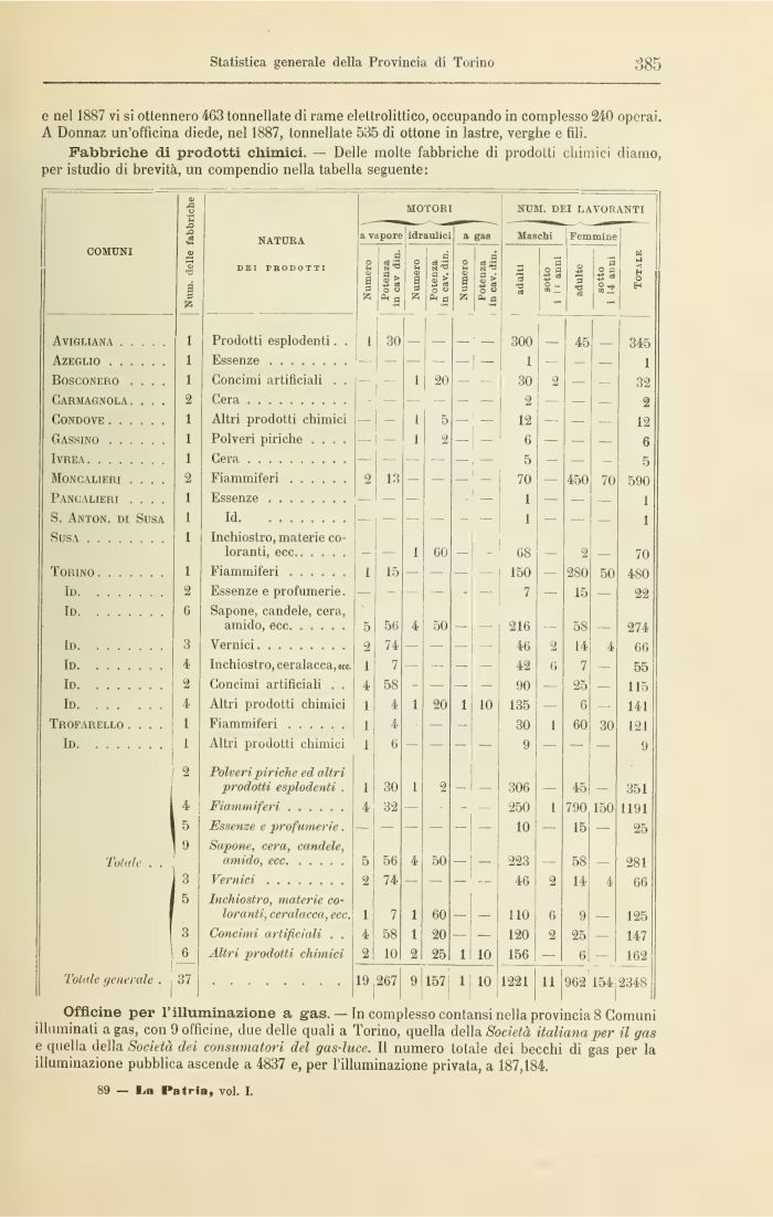 Officine per l'illuminazione a gas. — In complesso contansi nella provincia 8 Comuni illuminati a gas, con 9 officine, due delle quali a Torino, quella della Società italiana per il gas e quella della Società dei consumatori del gas-luce. Il numero totale dei becchi di gas per la illuminazione pubblica ascende a 4837 e, per l'illuminazione privata, a 187,184.