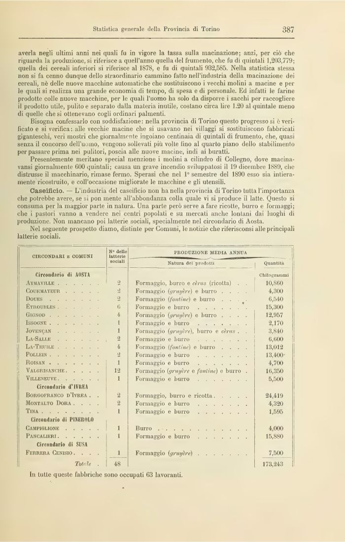 Caseifìcio. — L'industria del caseificio non ha nella provincia di Torino tutta l'importanza che potrebbe avere, se si pon mente all'abbondanza colla quale vi si produce il latte. Questo si consuma per la maggior parte in natura. Una parte però serve a fare ricotte, burro e formaggi; che i pastori vanno a vendere nei centri popolati e su mercati anche lontani dai luoghi di produzione. Non mancano poi latterie sociali, specialmente nel circondario di Aosta.