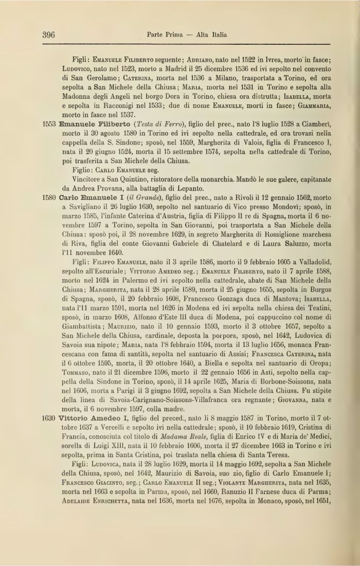 1553 Emanuele Filiberto (Testa di Ferro), figlio del prec., nato 1*8 luglio 1528 a Ciamberì, morto il 30 agosto 1580 in Torino ed ivi sepolto nella cattedrale, ed ora trovasi nella cappella della S. Sindone; sposò, nel 1559, Margherita di Valois, figlia di Francesco I, nata il 20 giugno 1524, morta il 15 settembre 1574, sepolta nella cattedrale di Torino, poi trasferita a San Michele della Chiusa.