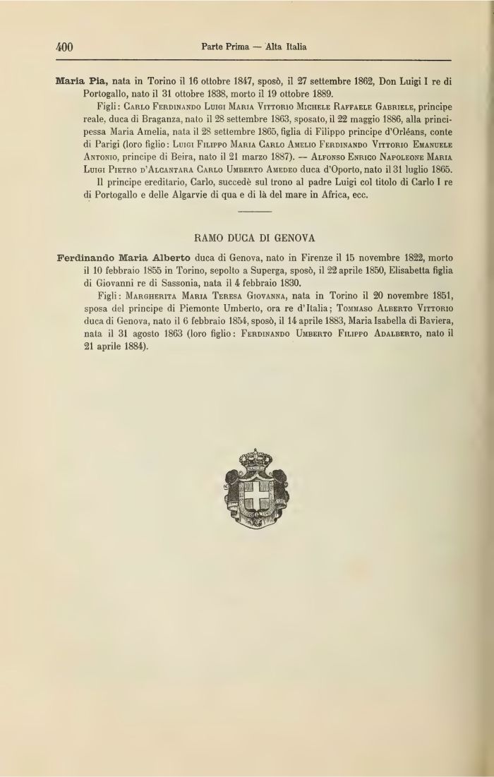 Ferdinando Maria Alberto duca di Genova, nato in Firenze il 15 novembre 1822, morto il 10 febbraio 1855 in Torino, sepolto a Superga, sposò, il 22 aprile 1850, Elisabetta figlia di Giovanni re di Sassonia, nata il 4 febbraio 1830.