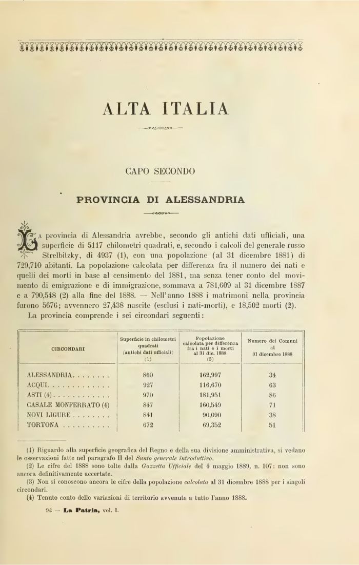 A provincia di Alessandria avrebbe, secondo gli antichi dati officiali, una superficie di 5117 chilometri quadrati, e, secondo i calcoli del generale russo Strelbilzky, di 4937 (1), con una popolazione (al 31 dicembre 1881) di 729,710 abitanti. La popolazione calcolata per differenza fra il numero dei nati e quelli dei morti in base al censimento del 1881, ma senza tener conto del movimento di emigrazione e di immigrazione, sommava a 781,609 al 31 dicembre 1887 e a 790,548 (2) alla fine del 1888. — Nell'anno 1888 i matrimoni nella provincia furono 5676; avvennero 27,438 nascite (esclusi i nati-morti), e 18,502 morti (2).