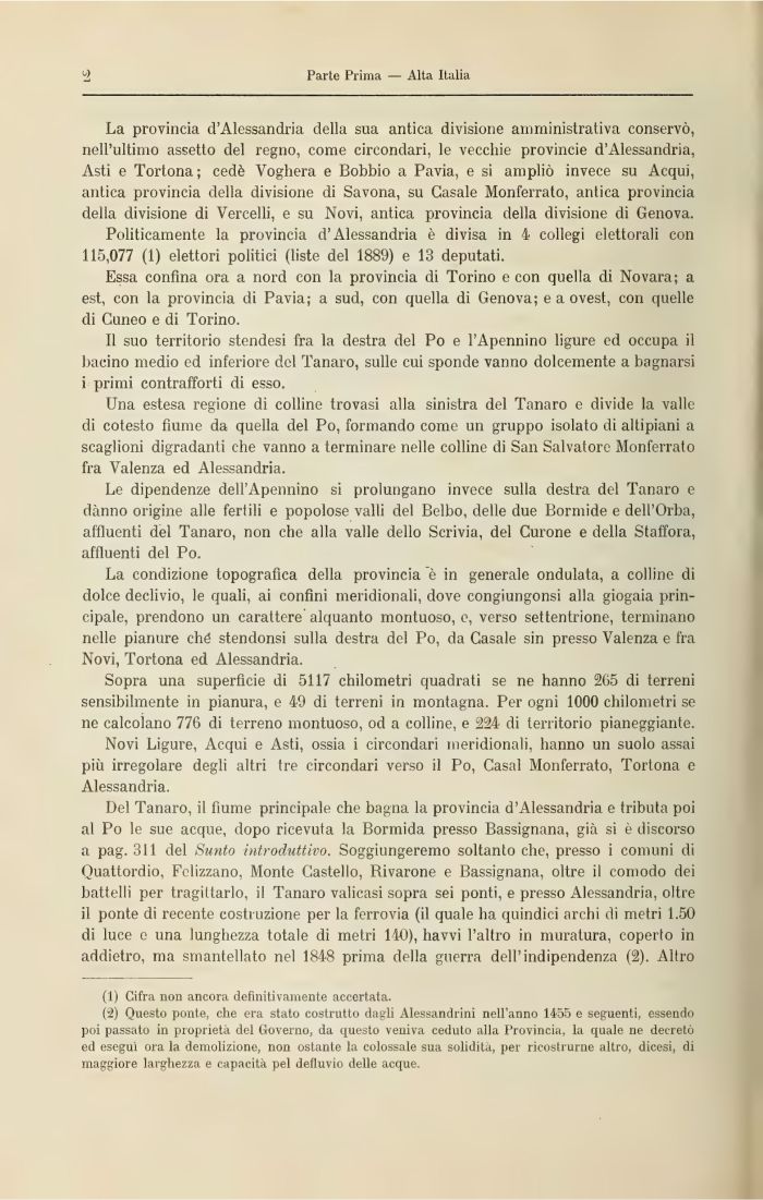 Del Tanaro, il fiume principale che bagna la provincia d'Alessandria e tributa poi al Po le sue acque, dopo ricevuta la Bormida presso Bassignana, già si è discorso a pag. 311 del Sunto introduttivo. Soggiungeremo soltanto che, presso i comuni di Quattordio, Felizzano, Monte Castello, Rivarone e Bassignana, oltre il comodo dei battelli per tragittarlo, il Tanaro valicasi sopra sei ponti, e presso Alessandria, oltre il ponte di recente costruzione per la ferrovia (il quale ha quindici archi di metri 1.50 di luce e una lunghezza totale di metri 14-0), havvi l'altro in muratura, coperto in addietro, ma smantellato nel 1848 prima della guerra dell'indipendenza (2). Altro