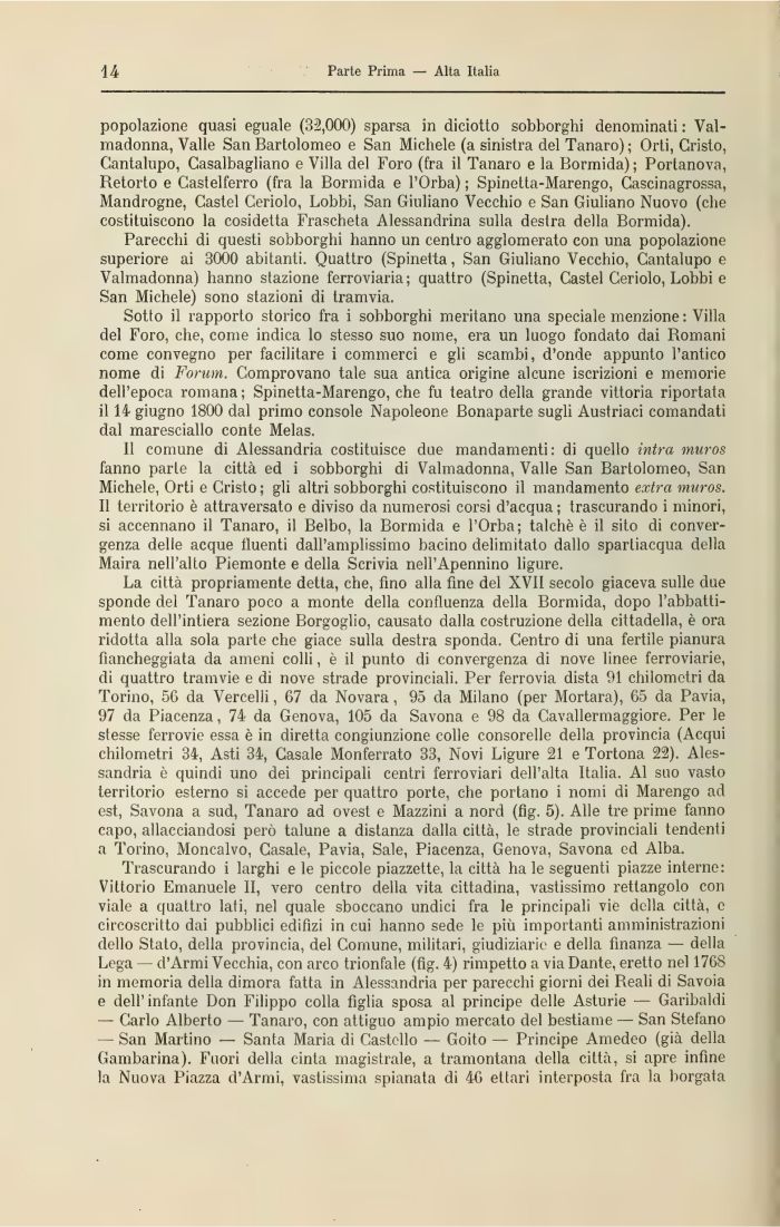 La città propriamente detta, che, fino alla fine del XVII secolo giaceva sulle due sponde del Tanaro poco a monte della confluenza della Bormida, dopo l'abbattimento dell'intiera sezione Borgoglio, causato dalla costruzione della cittadella, è ora ridotta alla sola parte che giace sulla destra sponda. Centro di una fertile pianura fiancheggiata da ameni colli, è il punto di convergenza di nove linee ferroviarie, di quattro tramvie e di nove strade provinciali. Per ferrovia dista 91 chilometri da Torino, 56 da Vercelli, 67 da Novara, 95 da Milano (per Mortara), 65 da Pavia, 97 da Piacenza, 74 da Genova, 105 da Savona e 98 da Cavallermaggiore. Per le stesse ferrovie essa è in diretta congiunzione colle consorelle della provincia (Acqui chilometri 34, Asti 34, Casale Monferrato 33, Novi Ligure 21 e Tortona 22). Alessandria è quindi uno dei principali centri ferroviari dell'alta Italia. Al suo vasto territorio esterno si accede per quattro porte, che portano i nomi di Marengo ad est, Savona a sud, Tanaro ad ovest e Mazzini a nord (fig. 5). Alle tre prime fanno capo, allacciandosi però talune a distanza dalla città, le strade provinciali tendenti a Torino, Moncalvo, Casale, Pavia, Sale, Piacenza, Genova, Savona ed Alba.