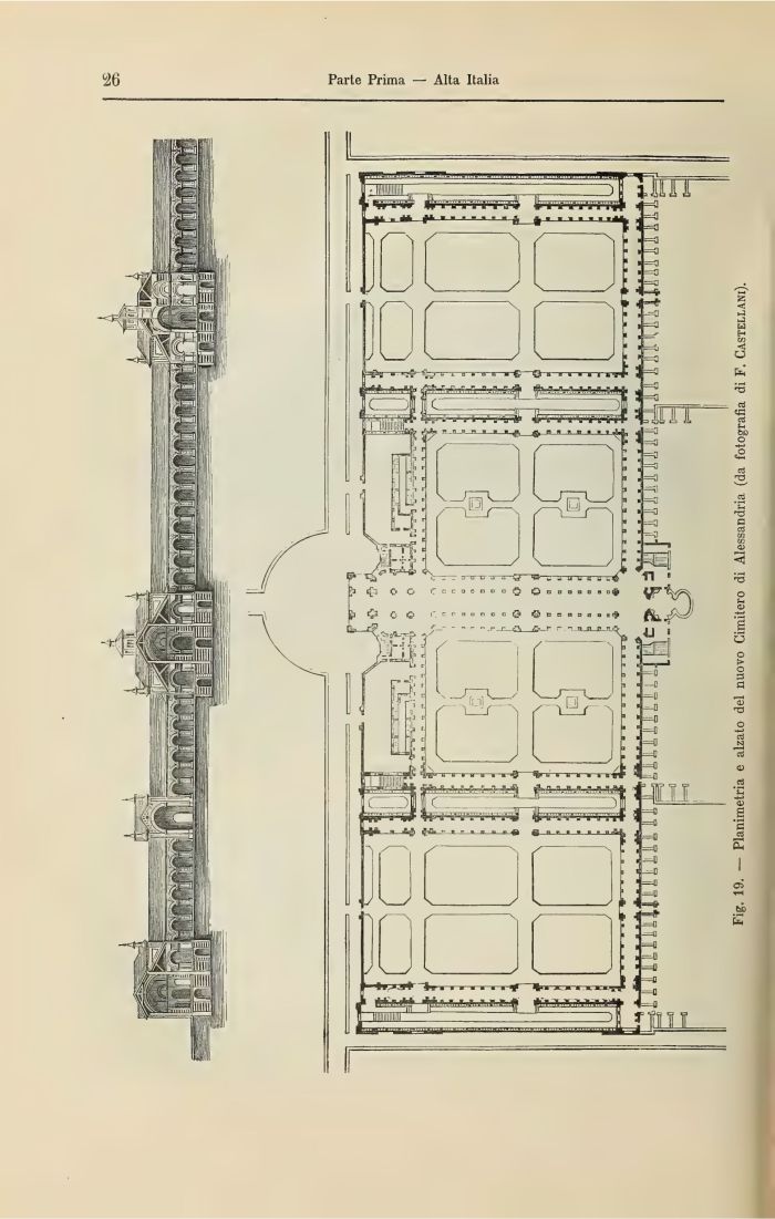 Fig. 19. — Planimetria e alzato del nuovo Cimitero di Alessandria (da fotografìa di F. Castellani).