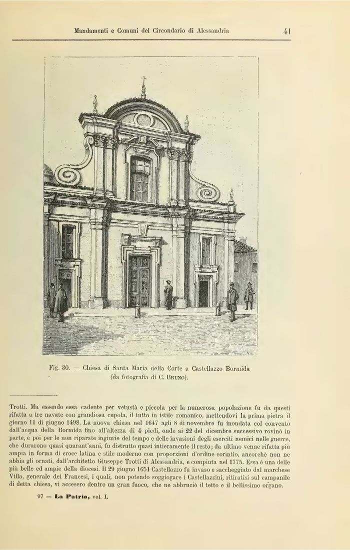 Trotti. Ma essendo essa cadente per vetustà e piccola per la numerosa popolazione fu da questi rifatta a tre navate con grandiosa cupola, il tutto in istile romanico, mettendovi la prima pietra il giorno 11 di giugno 1498. La nuova chiesa nel 1047 agli 8 di novembre fu inondata col convento dall'acqua della Bormida fino all'altezza di 4 piedi, onde ai 22 del dicembre successivo rovinò in parte, e poi per le non riparate ingiurie del tempo e delle invasioni degli eserciti nemici nelle guerre, che durarono quasi quarant'anni, fu distrutto quasi intieramente il resto; da ultimo venne rifatta più ampia in forma di croce latina e stile moderno con proporzioni d'ordine corintio, ancorché non ne abbia gli ornati, dall'architetto Giuseppe Trotti di Alessandria, e compiuta nel 1775. Essa è una delle più belle ed ampie della diocesi. Il 29 giugno 1651 Castellazzo fu invaso e saccheggiato dal marchese Villa, generale dei Francesi, i quali, non potendo soggiogare i Castellazzini, ritiratisi sul campanile di detta chiesa, vi accesero dentro un gran fuoco, che ne abbruciò il tetto e il bellissimo organo.