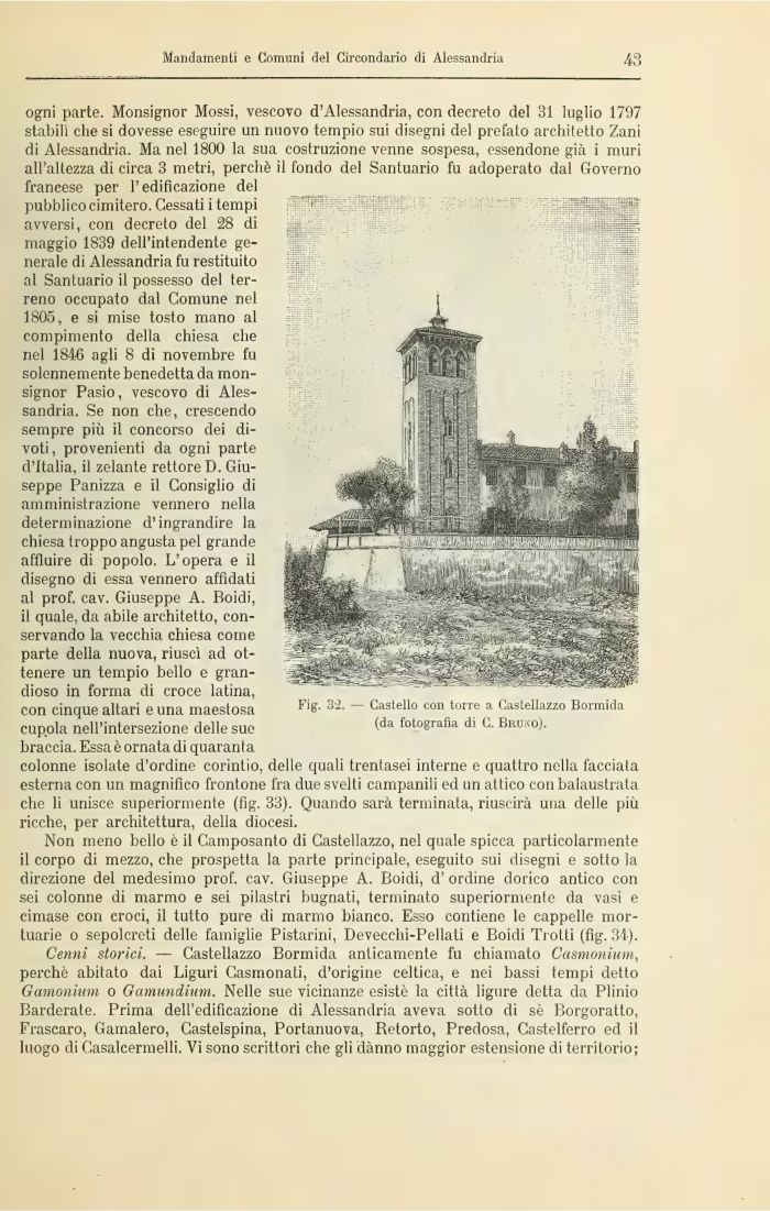 ogni parte. Monsignor Mossi, vescovo d'Alessandria, con decreto del 31 luglio 1797 stabilì che si dovesse eseguire un nuovo tempio sui disegni del prefato architetto Zani di Alessandria. Ma nel 1800 la sua costruzione venne sospesa, essendone già i muri all'altezza di circa 3 metri, perchè il fondo del Santuario fu adoperato dal Governo francese per l'edificazione del pubblico cimitero. Cessati i tempi avversi, con decreto del 28 di maggio 1839 dell'intendente generale di Alessandria fu restituito al Santuario il possesso del terreno occupato dal Comune nel 1805, e si mise tosto mano al compimento della chiesa che nel 1846 agli 8 di novembre fu solennemente benedetta da monsignor Pasio, vescovo di Alessandria. Se non che, crescendo sempre più il concorso dei divoti, provenienti da ogni parte d'Italia, il zelante rettore D. Giuseppe Panizza e il Consiglio di amministrazione vennero nella determinazione d'ingrandire la chiesa troppo angusta pel grande affluire di popolo. L'opera e il disegno di essa vennero affidati al prof. cav. Giuseppe A. Boidi, il quale, da abile architetto, conservando la vecchia chiesa come parte della nuova, riuscì ad ottenere un tempio bello e grandioso in forma di croce latina, con cinque altari e una maestosa 3-- ~ Castello con torre a Castellazzo Bormida