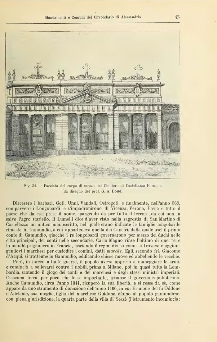 Fig. 34. — Facciata del corpo di mezzo del Cimitero di Castellazzo Bormida (da disegno del prof. G. A. Borni).