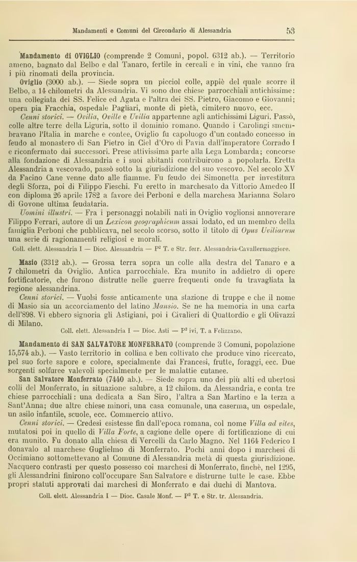 Oviglio (3000 ab.). — Siede sopra un picciol colle, appiè del quale scorre il Belbo, a 14 chilometri da Alessandria. Vi sono dne chiese parrocchiali antichissime: una collegiata dei SS. Felice ed Agata e l'altra dei SS. Pietro, Giacomo e Giovanni; opera pia Fracchia, ospedale Pagliari, monte di pietà, cimitero nuovo, ecc.