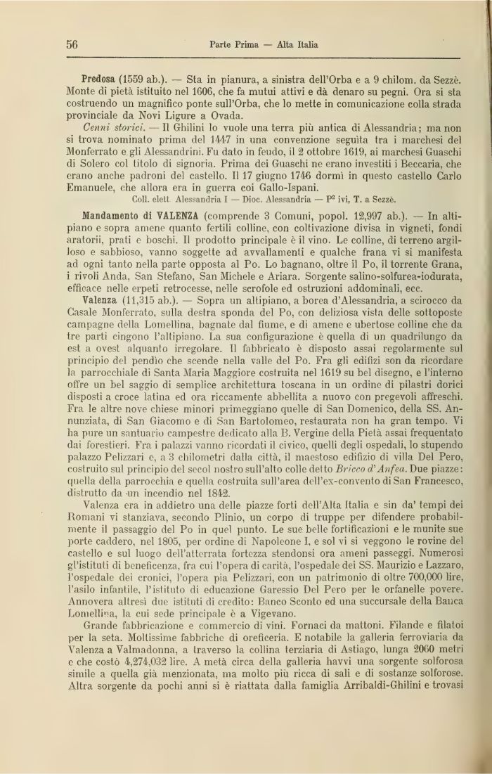 Predosa (1559 ab.). — Sta in pianura, a sinistra dell'Orba e a 9 chilom. da Sezzè. Monte di pietà istituito nel 1606, che fa mutui attivi e dà denaro su pegni. Ora si sta costruendo un magnifico ponte sull'Orba, che lo mette in comunicazione colla strada provinciale da Novi Ligure a Ovada.