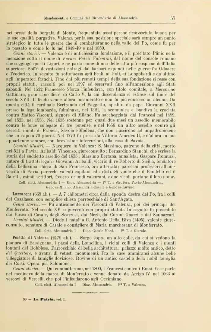 nei pressi della borgata di Monte, frequentata assai perchè riconosciuta buona pelle sue qualità purgative. Valenza per la sua posizione speciale sarà sempre un punto strategico in tutte le guerre che si combatteranno nella valle del Po, come fu per lo passato e come lo fu nel 1848-49 e nel 1859.