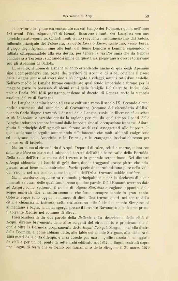 Ma il territorio acquense va rinomato principalmente per la ricchezza di acque minerali salutari, delle quali toccheremo qui due parole. Già i Romani avevano dato ad Acqui, come vedremo, il nome di Aquae Statiellae a cagione appunto delle acque minerali che vi scaturiscono e che furono sempre tenute in gran conto. Coteste acque Sono oggidì in numero di dieci. Una trovasi quasi nel centro della città e chiamasi la Bollente; sette scaturiscono alle falde del monte Stregone ed alimentano i bagni, la nona sgorga presso il torrente Ravanasco e la decima presso il torrente Medrio nel comune di Strevi.