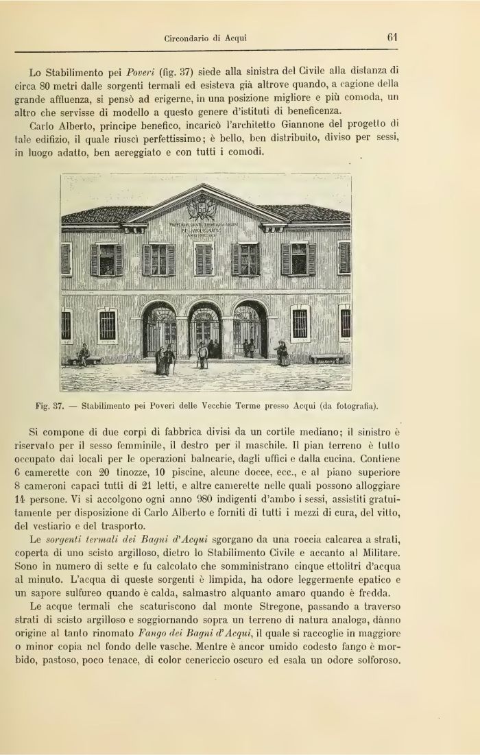 Lo Stabilimento pei Poveri (fig. 37) siede alla sinistra del Civile alla distanza di circa 80 metri dalle sorgenti termali ed esisteva già altrove quando, a cagione della grande affluenza, si pensò ad erigerne, in una posizione migliore e più comoda, un altro che servisse di modello a questo genere d'istituti di beneficenza.