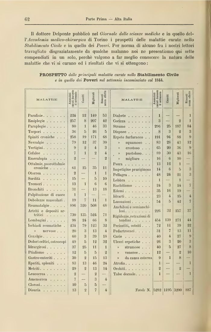 Il dottore Delponte pubblicò nel Giornale delle scienze mediche e in quello del-VAccademia medico-chirurgica di Torino i prospetti delle malattie curate nello Stabilimento Civile e in quello dei Poveri. Per norma di alcuno fra i nostri lettori travagliato disgraziatamente da qualche malanno noi ne presentiamo qui sette compendiati in un solo, perchè valgono a far meglio conoscere la natura delle malattie che vi si curano ed i risultati che vi si ottengono: