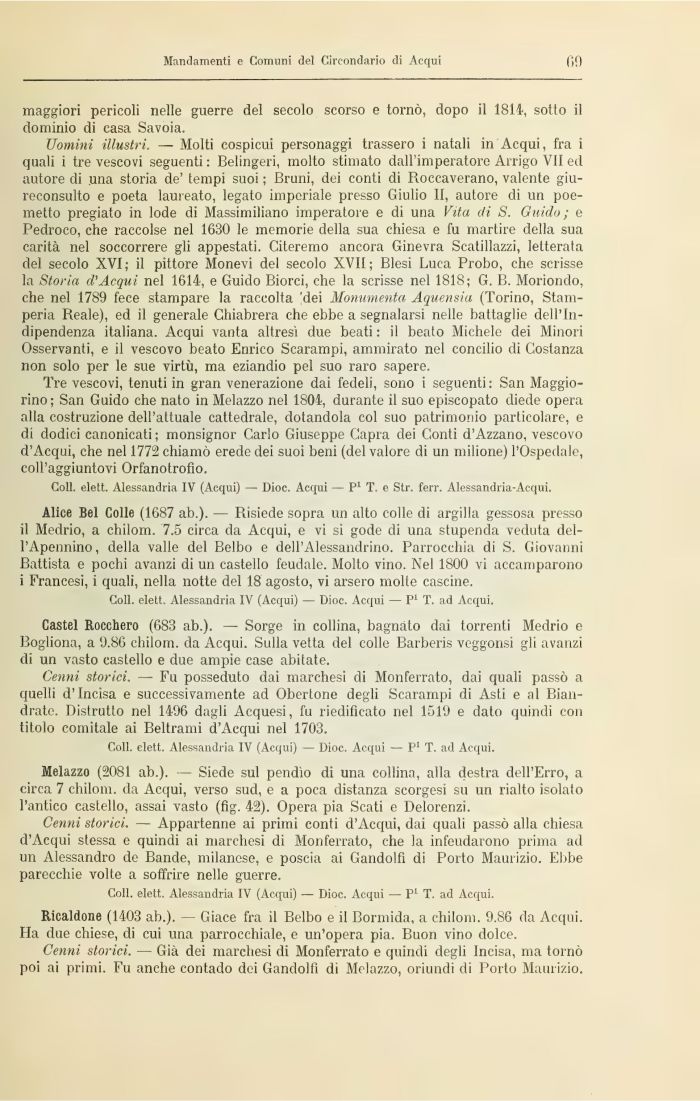 Melazzo (2081 ab.). — Siede sul pendìo di una collina, alla destra dell'Erro, a circa 7 chilom. da Acqui, verso sud, e a poca distanza scorgesi su un rialto isolato l'antico castello, assai vasto (fig. 42). Opera pia Scafi e Delorenzi.