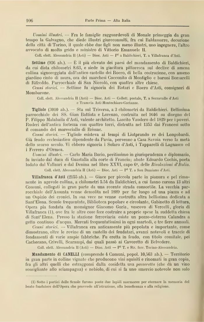 Villafranca d'Asti (2155 ab.). — Giace per piccola parte in pianura e pel rimanente in agevole collina, a chilometri 5.54 da Baldichieri, a cui fanno corona 13 altri Comuni, collegati in gran parte da una recente strada consortile. La vecchia parrocchiale dell'Assunta venne demolita nel 1889 per far luogo ad una piazza e ad un Ospizio dei cronici. In sua vece ne venne costrutta altra bellissima dedicata a Sant'Elena. Scuole frequentate, Biblioteca popolare e circolante, Gabinetto di lettura, Opera pia fondata da monsignor Giacomo Goria, vescovo di Vercelli, gloria di Villafranca (1), ove fra le altre cose fece costruire a proprie spese la suddetta chiesa di Sant'Elena. Presso la stazione ferroviaria esiste un pozzo-cisterna Calandra a getto continuo d'acqua. Mercati frequentatissimi in ogni martedì, e tre fiere annuali.
