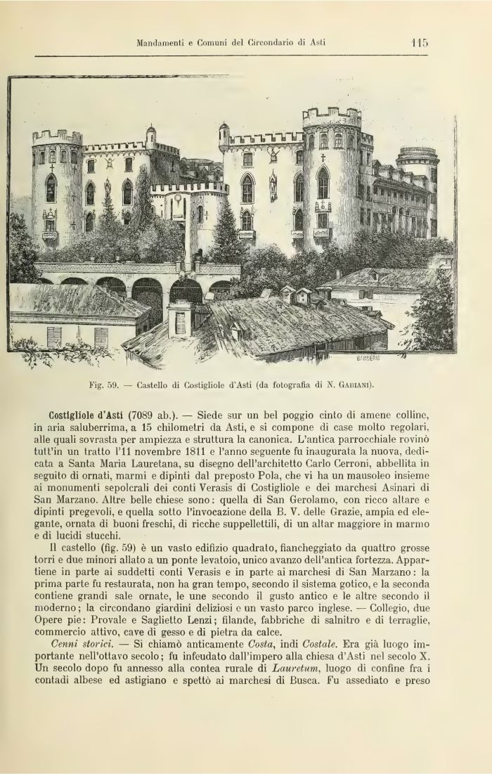 Il castello (fig. 59) è un vasto edifizio quadrato, fiancheggiato da quattro grosse torri e due minori allato a un ponte levatoio, unico avanzo dell'antica fortezza. Appartiene in parte ai suddetti conti Verasis e in parte ai marchesi di San Marzano: la prima parte fu restaurata, non ha gran tempo, secondo il sistema gotico, e la seconda contiene grandi sale ornate, le une secondo il gusto antico e le altre secondo il moderno ; la circondano giardini deliziosi e un vasto parco inglese. — Collegio, due Opere pie: Provale e Saglietto Lenzi; filande, fabbriche di salnitro e di terraglie, commercio attivo, cave di gesso e di pietra da calce.