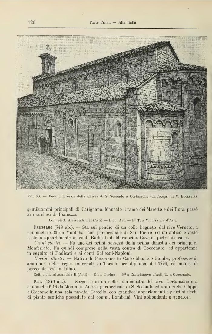 Passerano (748 ab.). — Sta sul pendìo di un colle bagnato dal rivo Verneto, a chilometri 7.30 da Montafia, con parrocchiale di San Pietro ed un antico e vasto castello appartenente ai conti Radicati di Marmorito. Cave di pietra da calce.