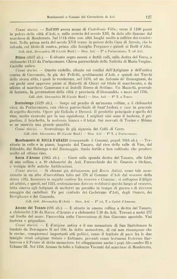 Azzano del Tanaro (694 ab.). — È situato in amena collina a destra del Tanaro, a chilometri 2.46 da Rocca d'Arazzo e a chilometri 7.20 da Asti. Trovasi a metri 177 sul livello del mare. Parrocchia sotto l'invocazione di San Giacomo apostolo. Vini barbèra e grignolino.