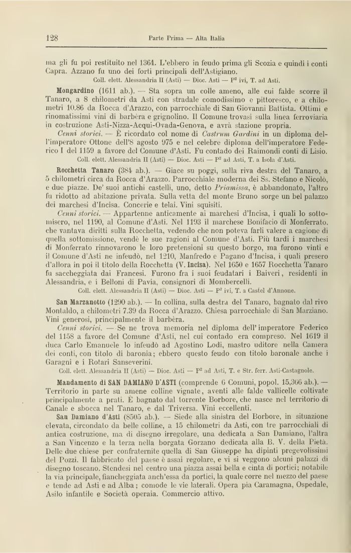 Mongardino (1611 ab.). — Sta sopra un colle ameno, alle cui falde scorre il Tanaro, a 8 chilometri da Asti con stradale comodissimo e pittoresco, e a chilometri 10.86 da Rocca d'Arazzo, con parrocchiale di San Giovarmi Battista. Ottimi e rinomatissimi vini di barbèra e grignolino. Il Comune trovasi sulla linea ferroviaria in costruzione Asti-Nizza-Acqui-Ovada-Genova, e avrà stazione propria.