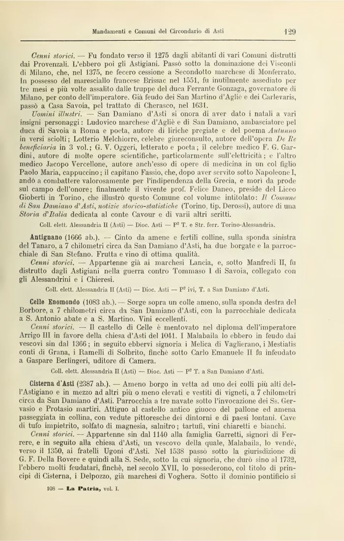 Uomini illustri. — San Damiano d'Asti si onora di aver dato i natali a vari insigni personaggi : Ludovico marchese d'Agliè e di San Damiano, ambasciatore pel duca di Savoia a Roma e poeta, autore di liriche pregiate e del poema Autunno in versi sciolti; Lotterio Melchiorre, celebre giureconsulto, autore dell'opera De Re beneficiaria in 3 voi.; G. V. Oggeri, letterato e poeta; il celebre medico F. G. Gar-dini, autore di molte opere scientifiche, particolarmente sull'elettricità; e l'altro medico Jacopo Vercellone, autore anch'esso di opere di medicina in un col figlio Paolo Maria, cappuccino ; il capitano Fassio, che, dopo aver servito sotto Napoleone I, andò a combattere valorosamente per l'indipendenza della Grecia, e morì da prode sul campo dell'onore; finalmente il vivente prof. Felice Daneo, preside del Liceo Gioberti in Torino, che illustrò questo Comune col volume intitolato: Il Comune-di San Damiano d'Asti, notizie storico-statistiche (Torino, tip. Derossi), autore di una Storia d'Italia dedicata al conte Cavour e di varii altri scritti.