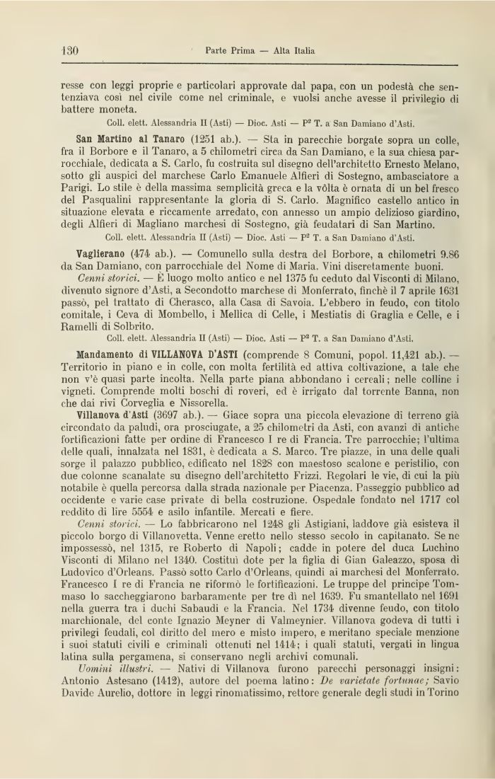 Vaglierano (474 ab.). — Comunello sulla destra del Borbore, a chilometri 9.86 da San Damiano, con parrocchiale del Nome di Maria. Vini discretamente buoni.