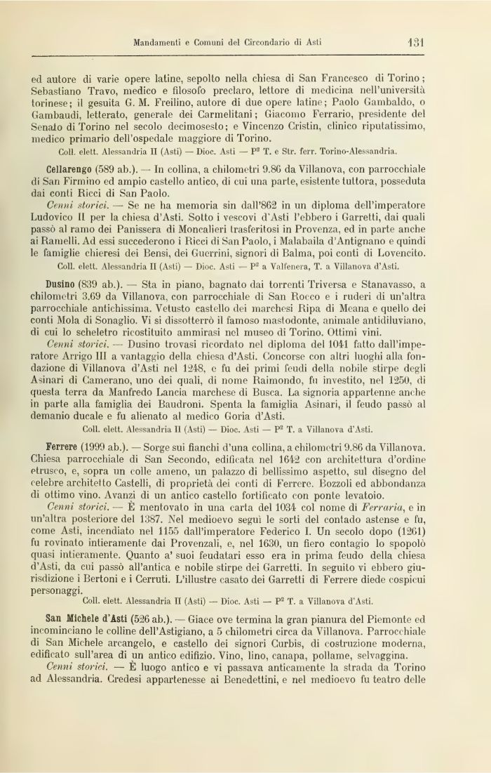Cellarengo (589 ab.). — In collina, a chilometri 9.8C da Villanova, con parrocchiale di San Firmino ed ampio castello antico, di cui una parte, esistente tuttora, posseduta dai conti Ricci di San Paolo.